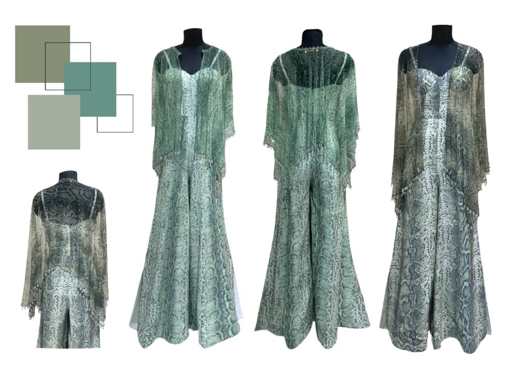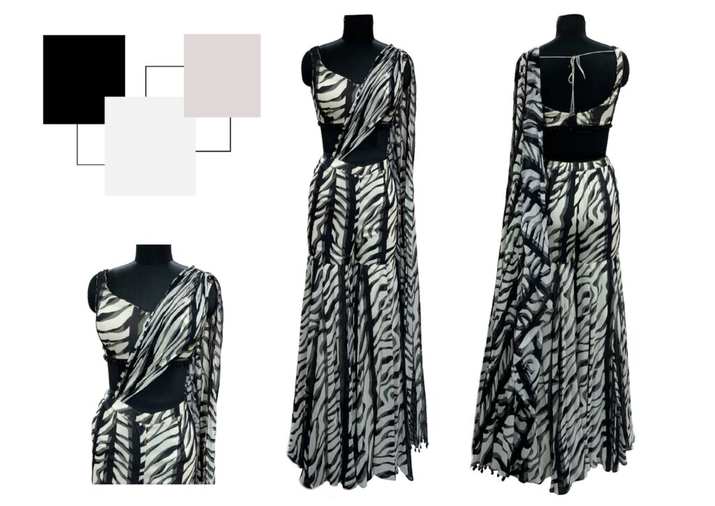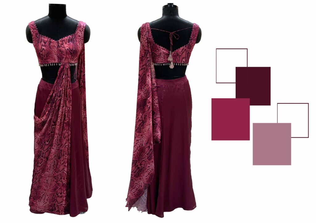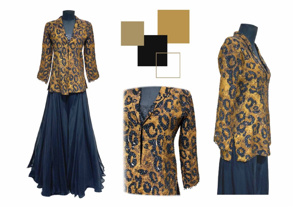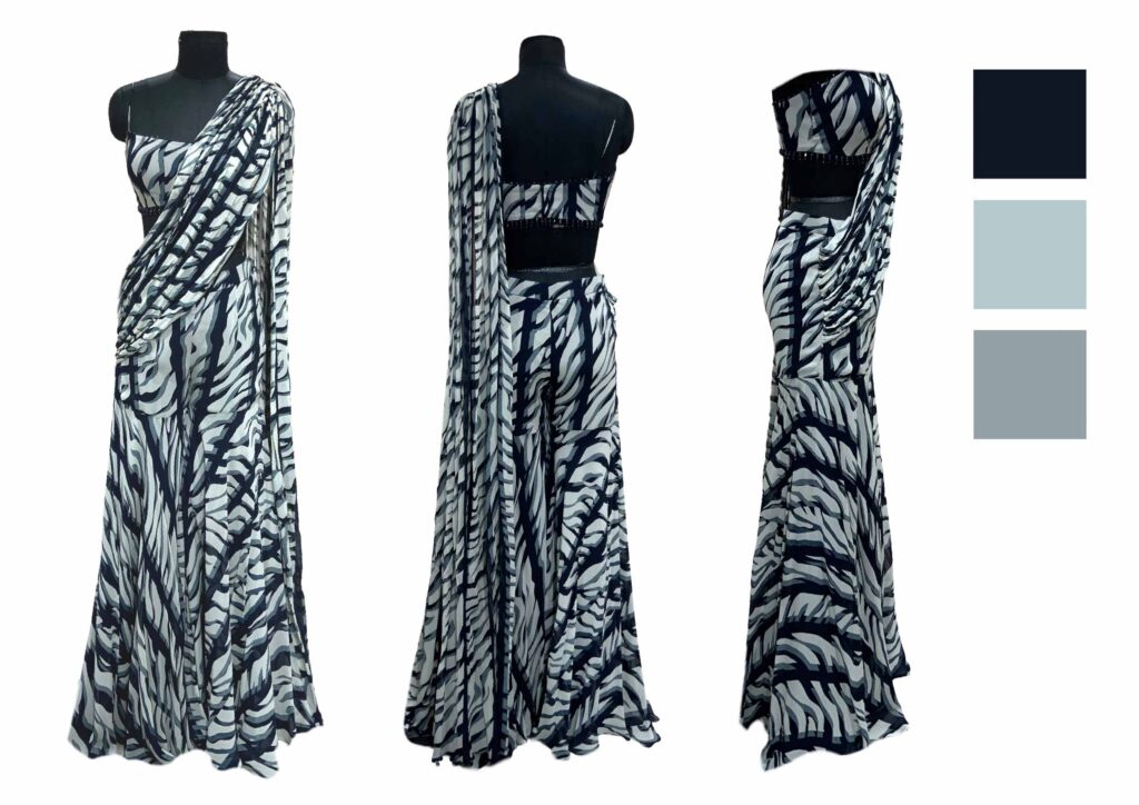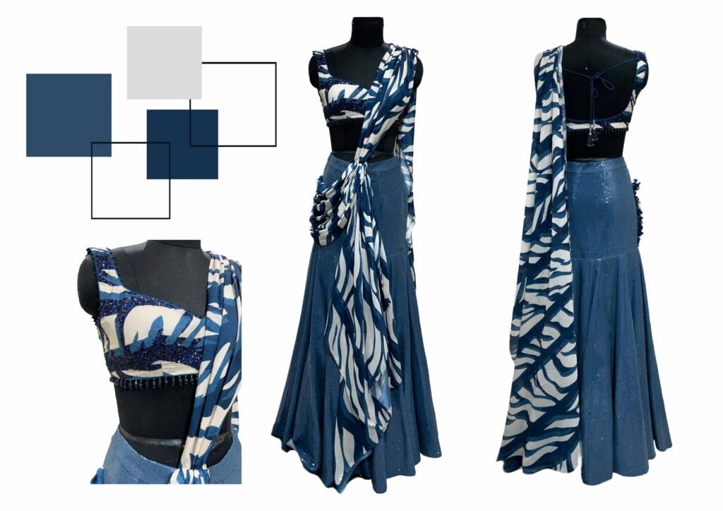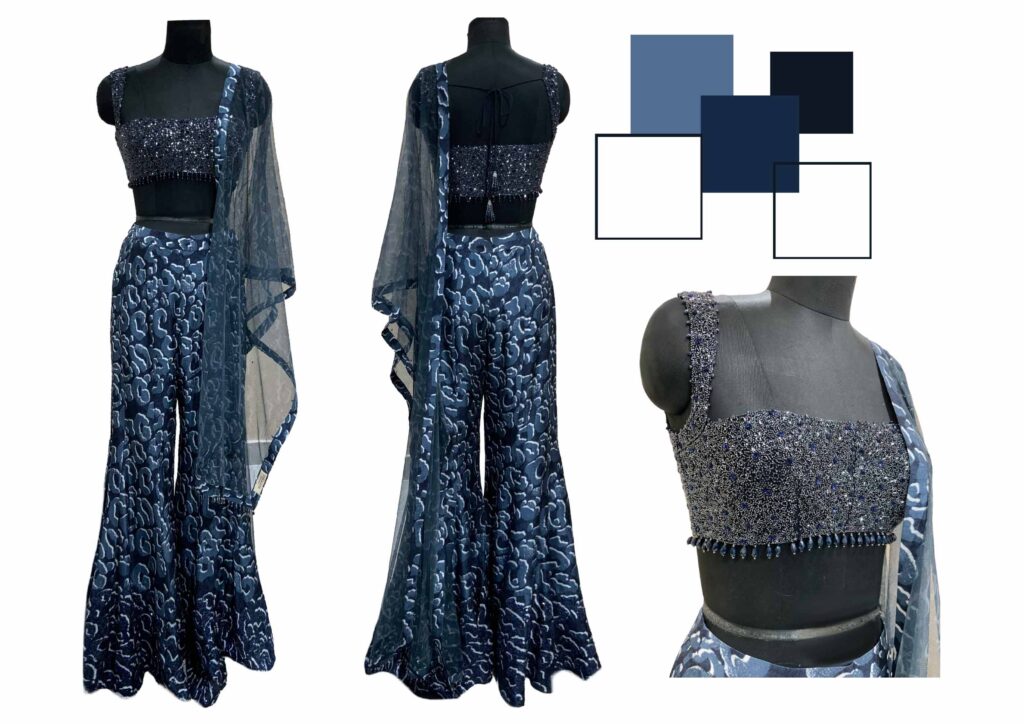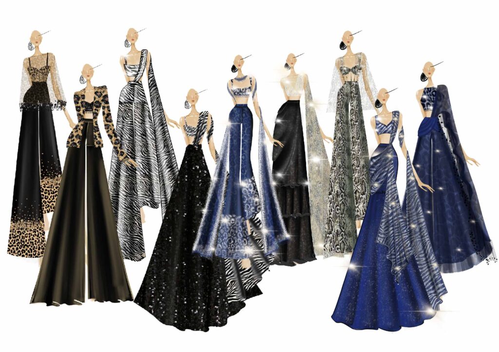 “Cocktail Collection” is a unique edition crafted in viscose chiffons, georgettes, slub silks, and soft nets, drenched in deep shades of black, blue, and wine. Accented with cutdhana and sequin embroidery, each piece shimmers with elegance—perfect for evening soirées and glamorous nights.
